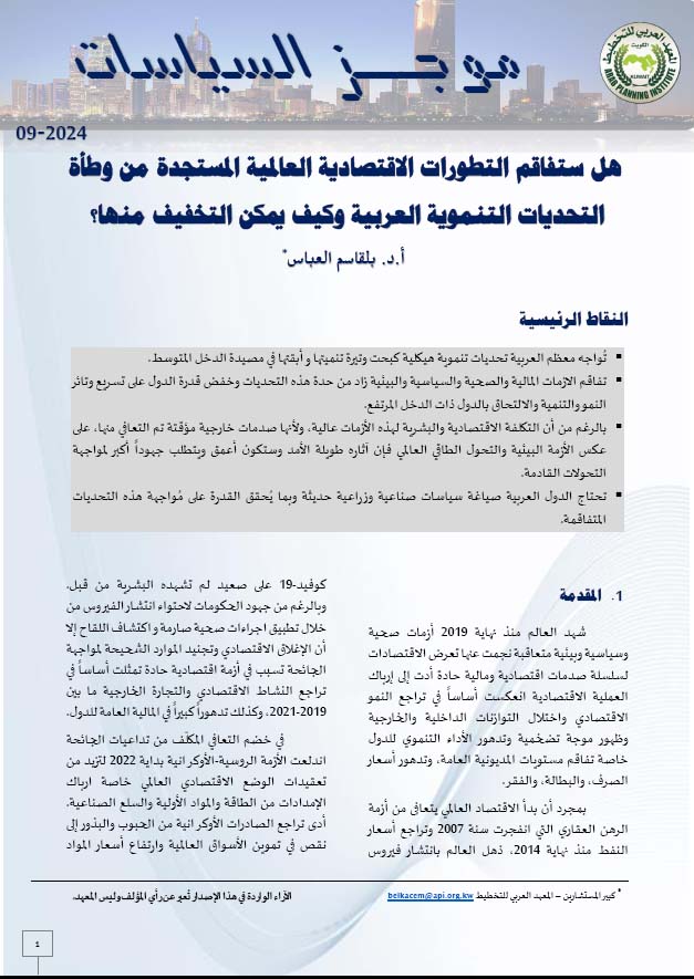 موجز السياسات - العدد التاسع بعنوان- "هل ستفاقم التطورات الاقتصادية العالمية المستجدة من وطأة التحديات" التنموية العربية وكيف يمكن التخفيف منها