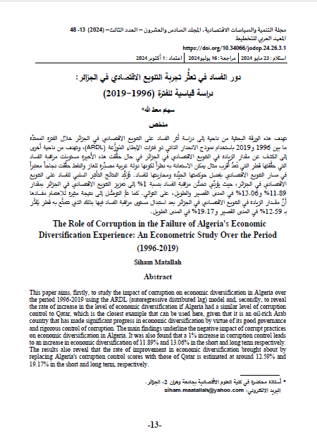 مجلة التنمية والسياسات الاقتصادية - دور الفساد في تعثُّر تجربة التنويع الاقتصادي في الجزائر: دراسة قياسية للفترة (1996-2019)